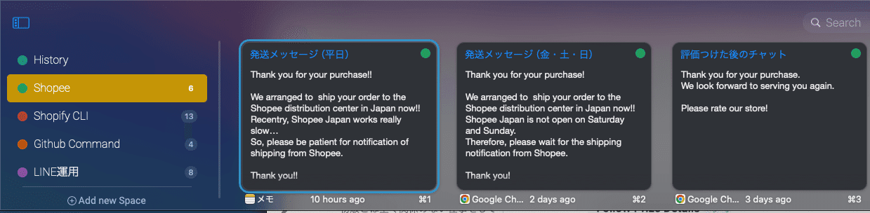 内容は、「土日はShopee Japanが休みだからちょっと待ってね」「最近Shopeeがバイヤーさんに連絡するのが遅いみたいだからちょっと待ってね」など。「まだ商品送ってくれてないんですか?」のような無駄なチャットを減らす為。 - 管理画面右上の鈴マークをクリックして、「Order Completed」のお知らせがあったら、こちらから先にバイヤーを星5つで評価し、自分のショップの評価もお願いするための定型文を送る。こちらでお願いしなくても、自ら評価してくれるバイヤーさんも多いが、より多くの評価を獲得して強いショップになるために、欠かさずに行っています。