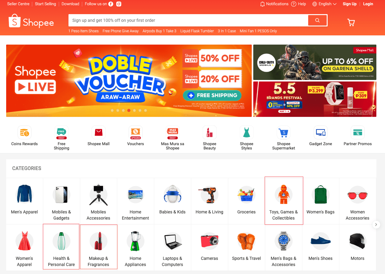 まずは、Shopeeの購入者が見るページで、自分の売りたいカテゴリーを選択します。売れ行きが良いおすすめは、おもちゃ・アニメ関係、ヘルスケア関係(医薬品は注意が必要)、ビューティー関係です。