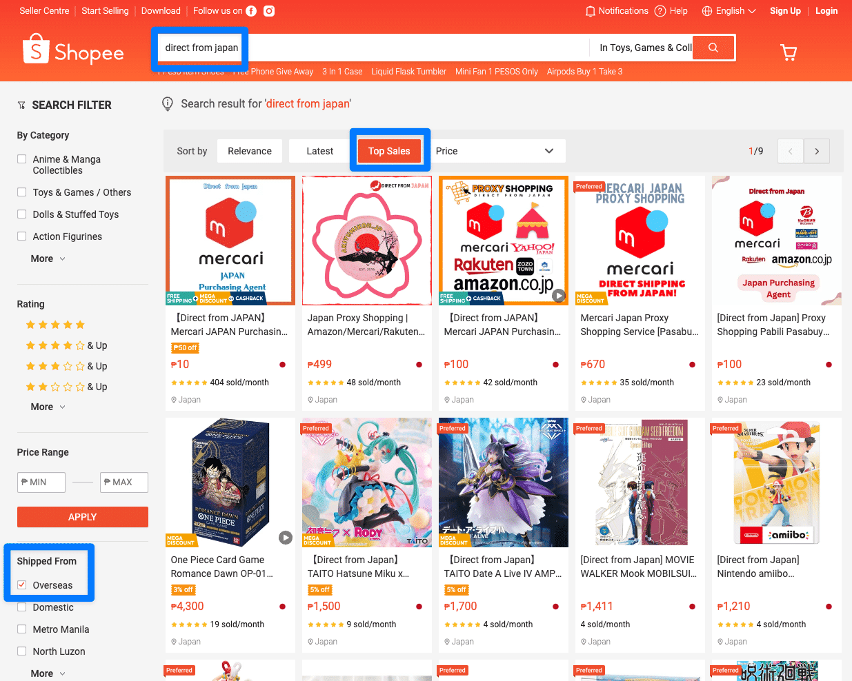 - カテゴリー選択後に検索窓に「Direct from Japan」と入れて検索、日本のセラーを探します。