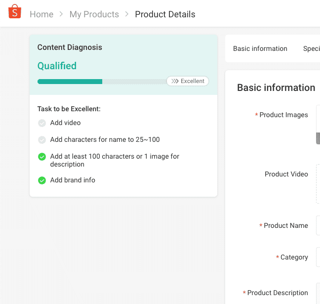 最近、商品登録画面の左上に表示されるようになった「Content Diagnosis」、ここに書かれていることを満たすことでプレビューが増えるとShopeeからのコメントがあります。