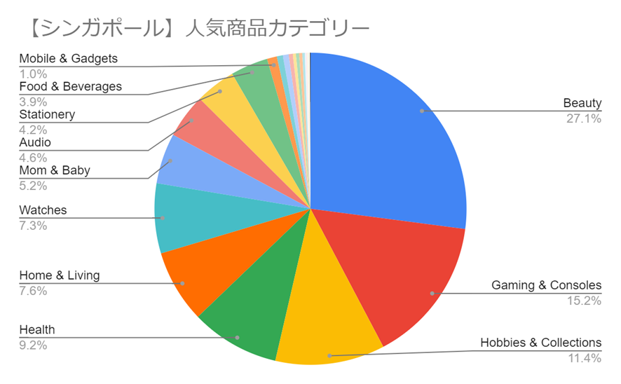 トップの美容関連商品が全体の3割近くを占め、次いでゲーム関連が約15%、さらにホビー関連が約11%と続きます。この3つのカテゴリーで販売数全体の半数を占めているのがShopeeシンガポールの特徴です。