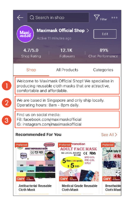Shopee公式の声明としてストアページでも以下のように、①取扱い商品や公式ストアであること、②拠点や営業時間、③ホームぺージのURLやSNSアカウント を記載することでSEOの最適化に繋がります。