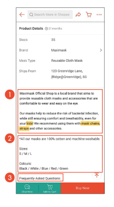 Shopeeの公式の推奨は①商品紹介は最低400文字以上、②製品のサイズ、カラー、素材、③FAQ、④キーワードを1-2回以上を記載することが有効です。
