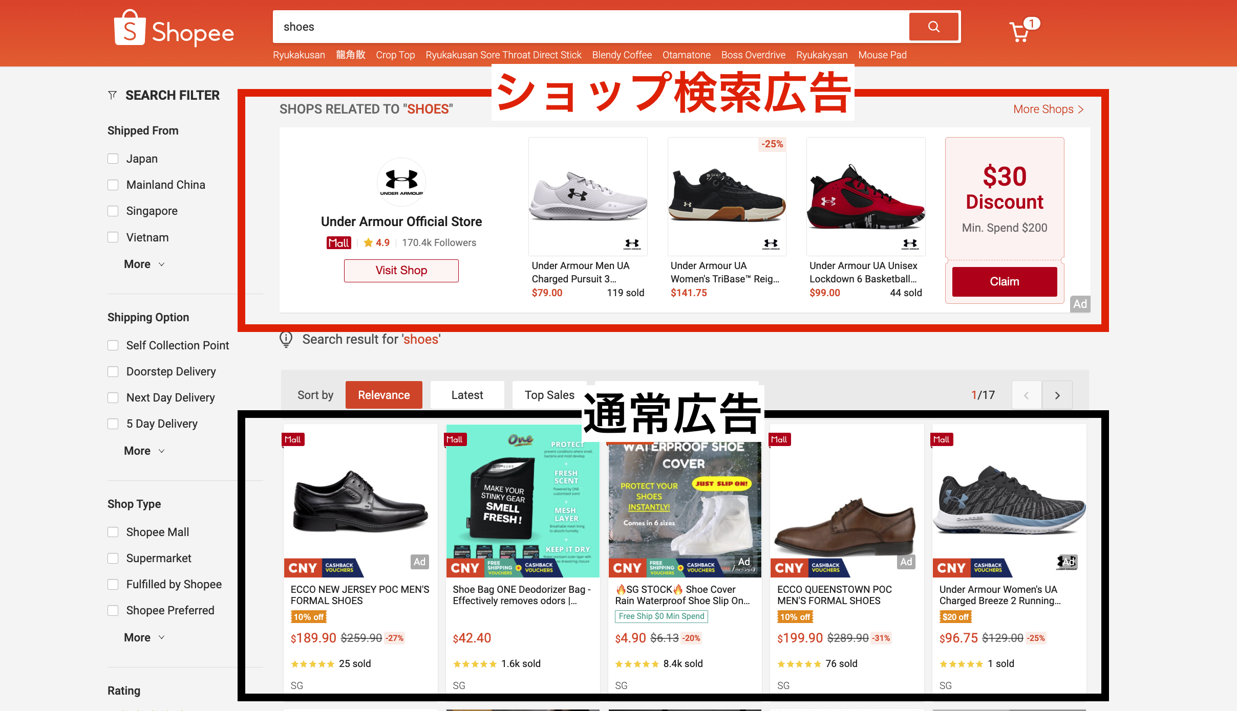 例えばShopeeシンガポールで「shoes」と検索したとき、ショップ検索広告として「Under Armour Official Store」が表示されています。
